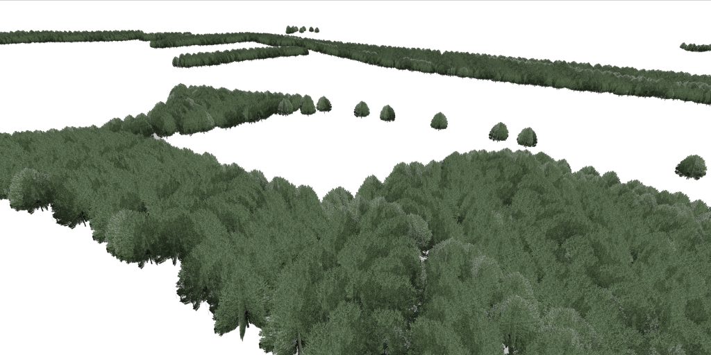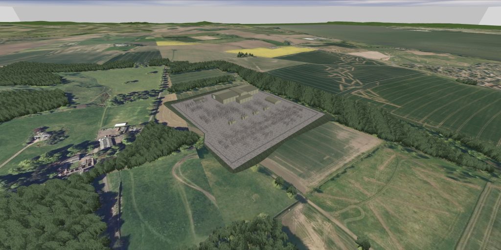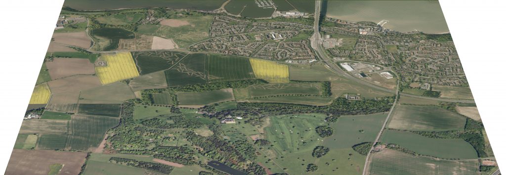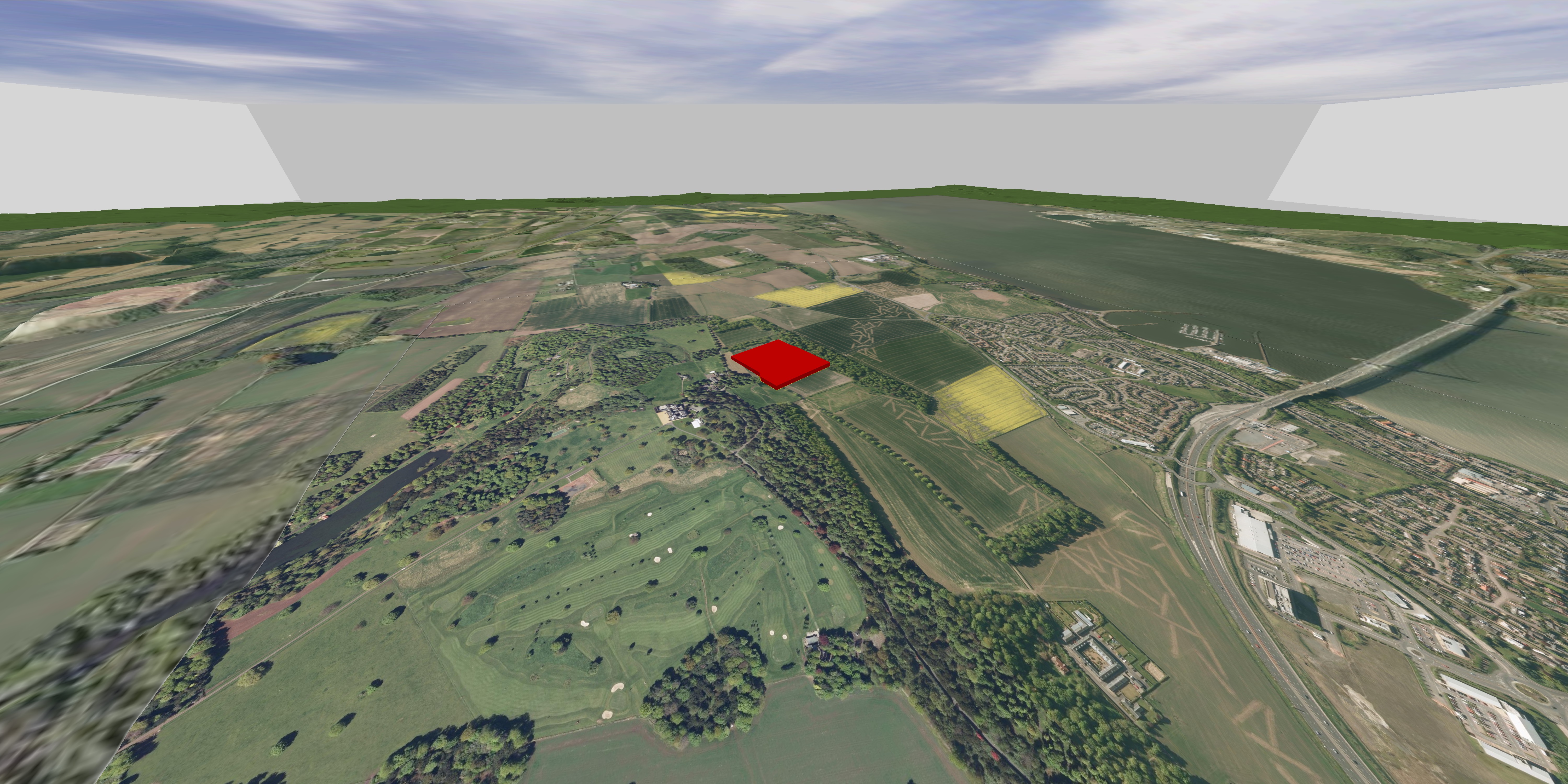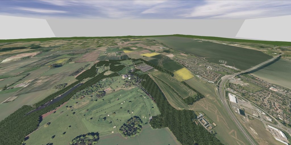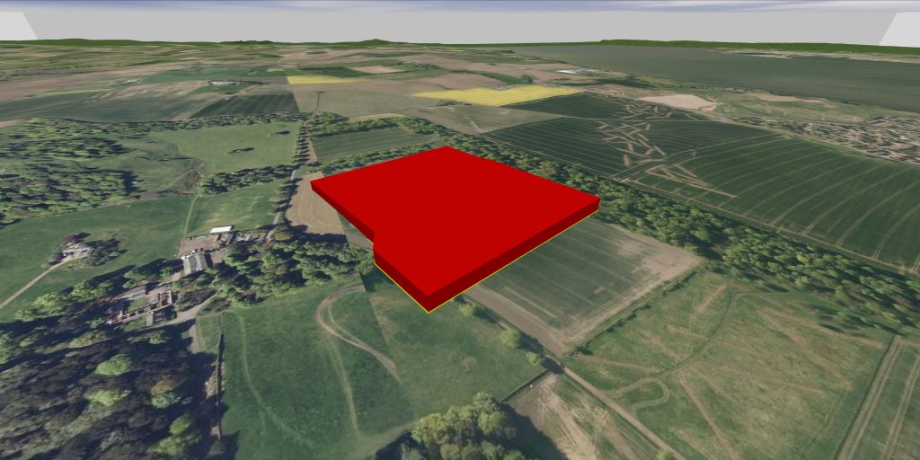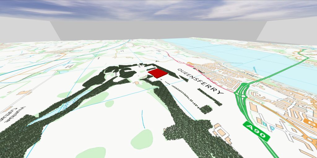 This option gives a more realistic visualisation by having accurately detailed models of the proposed development and the surrounding landscape (trees, fences, roads, etc.).